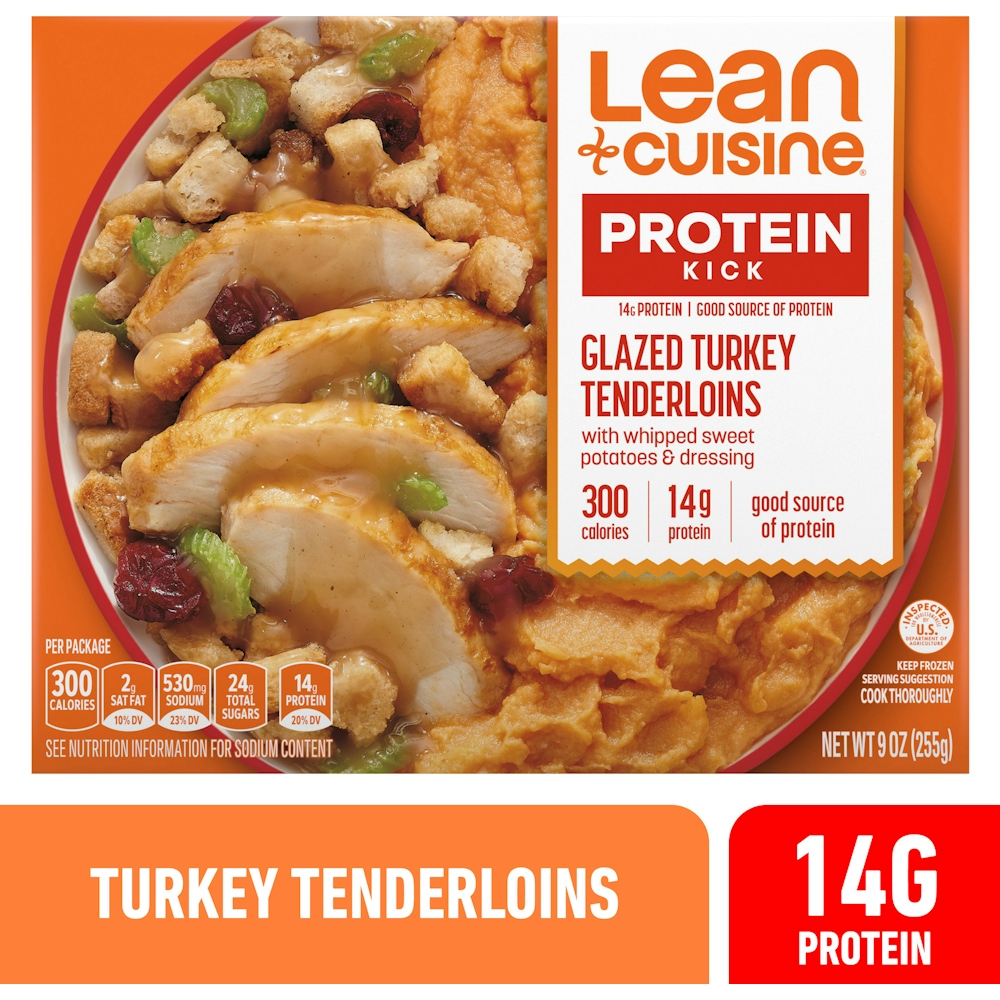 Add a kick of protein to your day with a Lean Cuisine Glazed Turkey Tenderloins Frozen Meal. At 300 calories and 14 grams of protein per package, this easy-to-make Lean Cuisine entree is a good source of protein and features turkey with whipped sweet potatoes and dressing. Each of these 9-ounce frozen turkey TV dinners can be enjoyed on its own or served with a side salad as part of an easy meal. Quick and easy to prepare, this microwave meal is ready in under seven minutes and makes a convenient lunch, easy dinner or snack. Lean Cuisine entrees are made with premium ingredients for a tasty, feel-good meal. This frozen turkey dinner is made with no artificial flavors or colors* for a satisfying frozen bowl. Lean Cuisine frozen meals are not your mother’s diet food. You won’t find any fad diets or miracle cures here – just a solid nutritional foundation and great taste. Lean Cuisine helps you take control of your wellness goals with a variety of delicious frozen dinners and snacks, all 400 calories or less. For more meal options from Lean Cuisine with a good source of protein, try Lean Cuisine Vermont White Cheddar Mac and Cheese or Baked Chicken. *Added colors from natural sources.