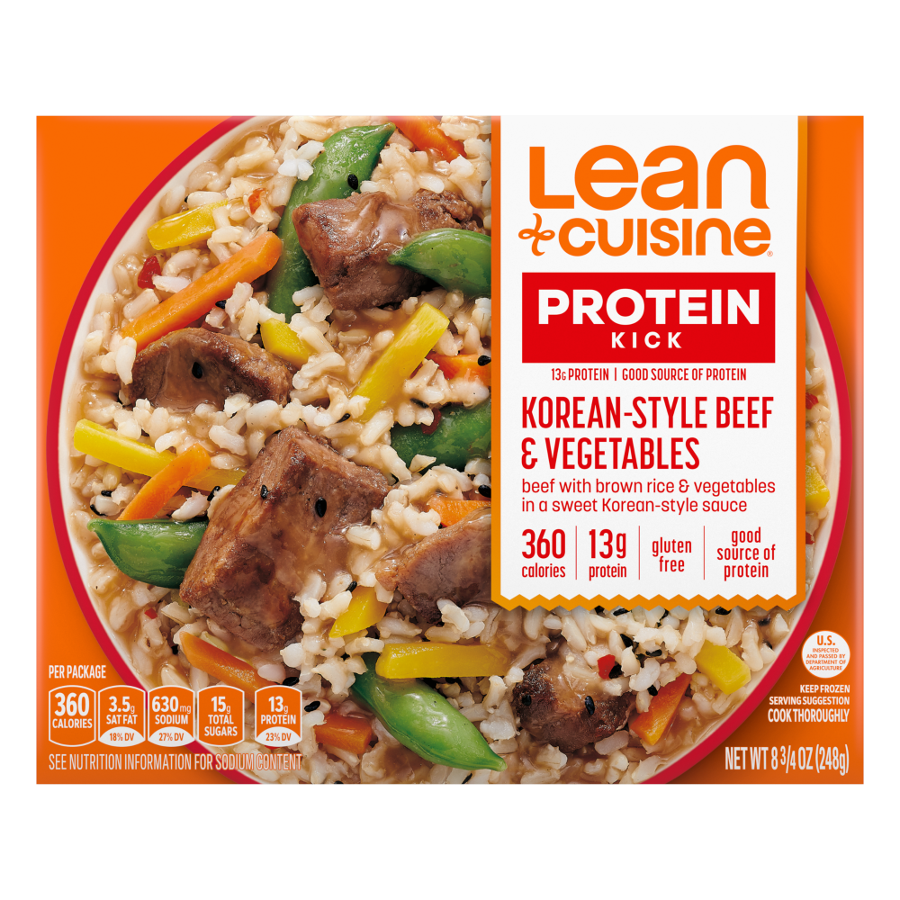 Add a kick of protein to your day with a Lean Cuisine Protein Kick Korean-Style Beef and Vegetables Frozen Meal. At 360 calories and 13 grams of protein per package, this easy-to-make Lean Cuisine prepared meal is a good source of protein and features beef with brown rice and vegetables in a sweet Korean-style sauce. Each 8.75-ounce frozen Korean-Style meal can be enjoyed on its own or served with a side salad. Pair your Lean Cuisine frozen bowl with soup or customize it with your favorite add-ons. This microwave meal is ready in less than six minutes and makes a convenient lunch, dinner or snack. Lean Cuisine entrees are made with premium ingredients for a tasty, feel-good meal. This Lean Cuisine gluten free dinner is made with no artificial flavors or preservatives. Lean Cuisine frozen meals are not your mother’s diet food. You won’t find fad diets or miracle cures here – just a solid nutritional foundation and great taste. Lean Cuisine offers a variety of delicious frozen dinners and snacks, all 400 calories or less. For more meal options from Lean Cuisine with a good source of protein, try Lean Cuisine Protein Kick Tortilla Crusted Fish or Sesame Chicken.