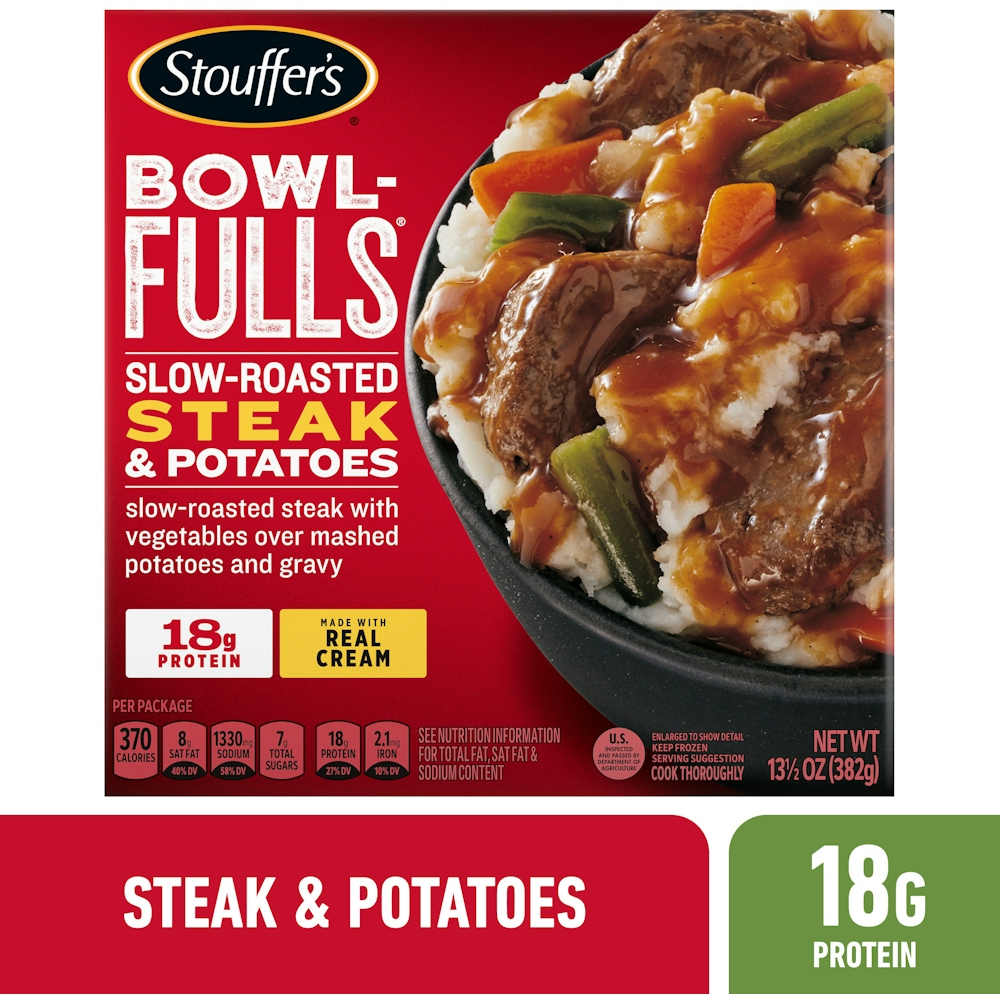 - The product category for Stouffer'S Bowl-Fulls Slow-Roasted Steak & Potatoes Frozen Meal is Potatoes.