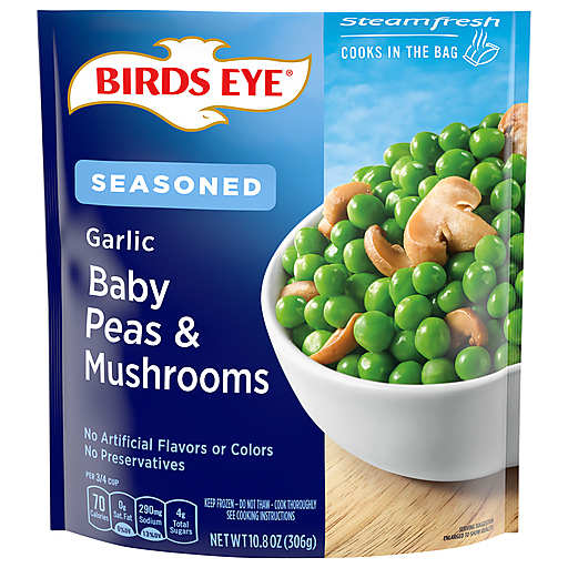 Birds Eye Steamfresh Garlic Baby Peas & Mushrooms frozen vegetables make it simple and easy for the whole family to enjoy their vegetables. These baby peas and mushrooms are seasoned with garlic. Birds Eye frozen mushrooms and peas make a tasty addition to any meal. Your family deserves the best when it comes to eating vegetables, and that's why there are no artificial preservatives, flavors or colors added. Enjoy these frozen peas and mushrooms as a side dish at dinnertime to add a serving of vegetables.It's good to eat vegetables, so Birds Eye makes vegetables good to eat.