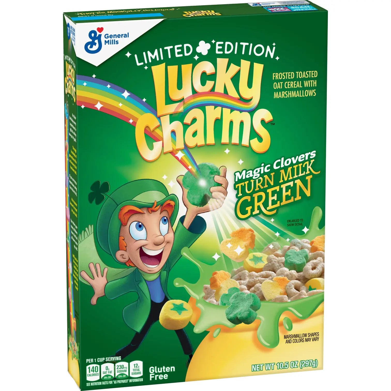 The special Green Milk Turn Lucky Charms include the same frosted oats cereal pieces with marshmallows in shapes like gold coins and pots of gold. In these boxes, special green clover marshmallows will turn the milk green to add a festive element to your breakfast.