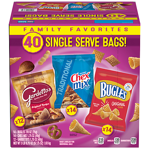 The original snack mix. Perfect for a snack on the go. With General Mills Family Favorities Variety Pack, enjoy your favorite General Mills snacks: Gardetto's, Bugles and Chex Mix. Endless taste and texture combinations make these the perfect party mix snack for get-togethers of all shapes and sizes. Not your standard snack bags, pub mix, trail mix, or bar snack, these snack bags are perfect for the lunch box or a grab and go snack as you head out the door. Stock your pantry with these delicious snack bag to share with friends and family. Contains 40 snack bags in total: 12 Gardetto's, 14 Bugles Original, 14 Chex Mix Traditional.