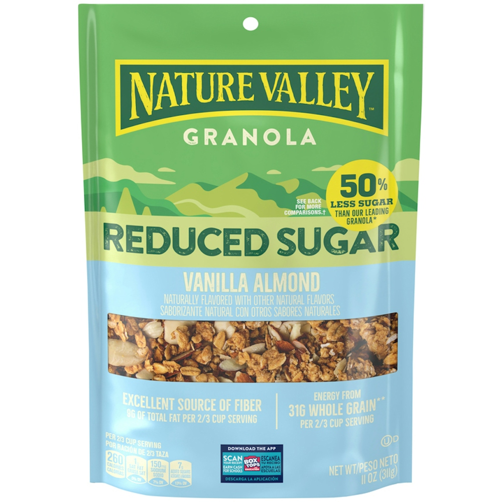 Fuel adventures with Nature Valley Reduced Sugar Vanilla Almond Granola, naturally flavored with other natural flavors. A serving has 50% less sugar than our leading granola.* Each 2/3 cup serving provides energy from 31g whole grain (at least 48g recommended daily), plus an excellent source of fiber (Nine g of total fat per 2/3 cup serving). There are no artificial flavors, colors, or high fructose corn syrup. Enjoy as a breakfast cereal or snack. Add fruit and nuts for DIY trail mix. Sprinkle over yogurt or an acai bowl. The pouch is resealable for easy school snacks. At Nature Valley, we believe that what you put in is what you get out. Wherever the moment takes you, you can rely on our snacks to help keep you going. *Reduced Sugar Vanilla Almond Granola has Seven g sugar per 65g serving. Our leading Granola (Nature Valley Protein Oats and Honey) has 16g sugar per 65g serving.