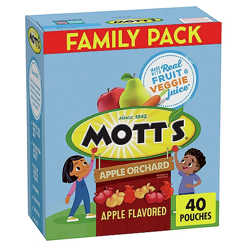 When you need a tasty snack for kids of all ages, choose Mott's Apple Orchard Fruit Flavored Snacks! Delicious, bite-sized gummies are made with real fruit and veggie juice* and have 60% daily value of vitamin C per serving. They're gluten free, gelatin free, fat free, and have no colors from artificial sources. Family pack contains 40 pouches. *These fruit-flavored snacks are made with pear, apple, and carrot juice concentrates. See nutritional panel on the box for a complete list of ingredients. They are not intended to replace fruit or vegetables in the diet.