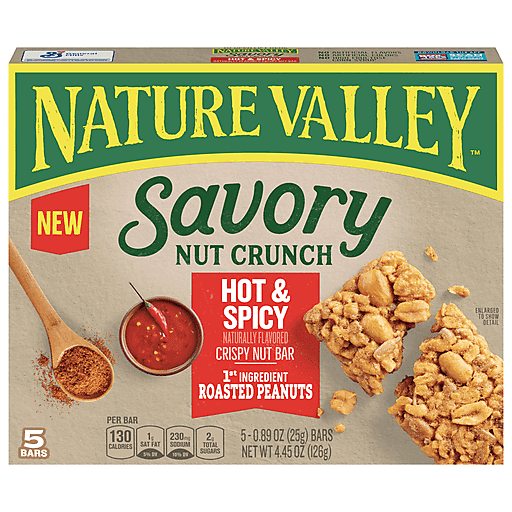 Bars. Grocery & Gourmet Food. Nut Bars. Snack Foods. Snacks & Sweets. When your taste buds are craving something savory, reach for Nature Valley Savory Nut Crunch bars. These crispy nut bars are the perfect on-the-go option for a satisfying savory snack you can feel good about. Our Hot and Spicy crunch bars delivers a just-right kick of heat, with roasted peanuts as the first ingredient. These bars are made with no artificial flavors, no artificial colors, and no high fructose corn syrup. Add them to your pantry as an on-the-go snack ideal for a lunch box or hiking trail. Make them your go-to afternoon snack bar, an office snack, or an on-the-go treat everyone in your household can enjoy. At Nature Valley, we believe that what you put in is what you get out. So wherever the moment takes you and your family, you can rely on our great-tasting snacks to help keep you going. Includes five crunch bars.