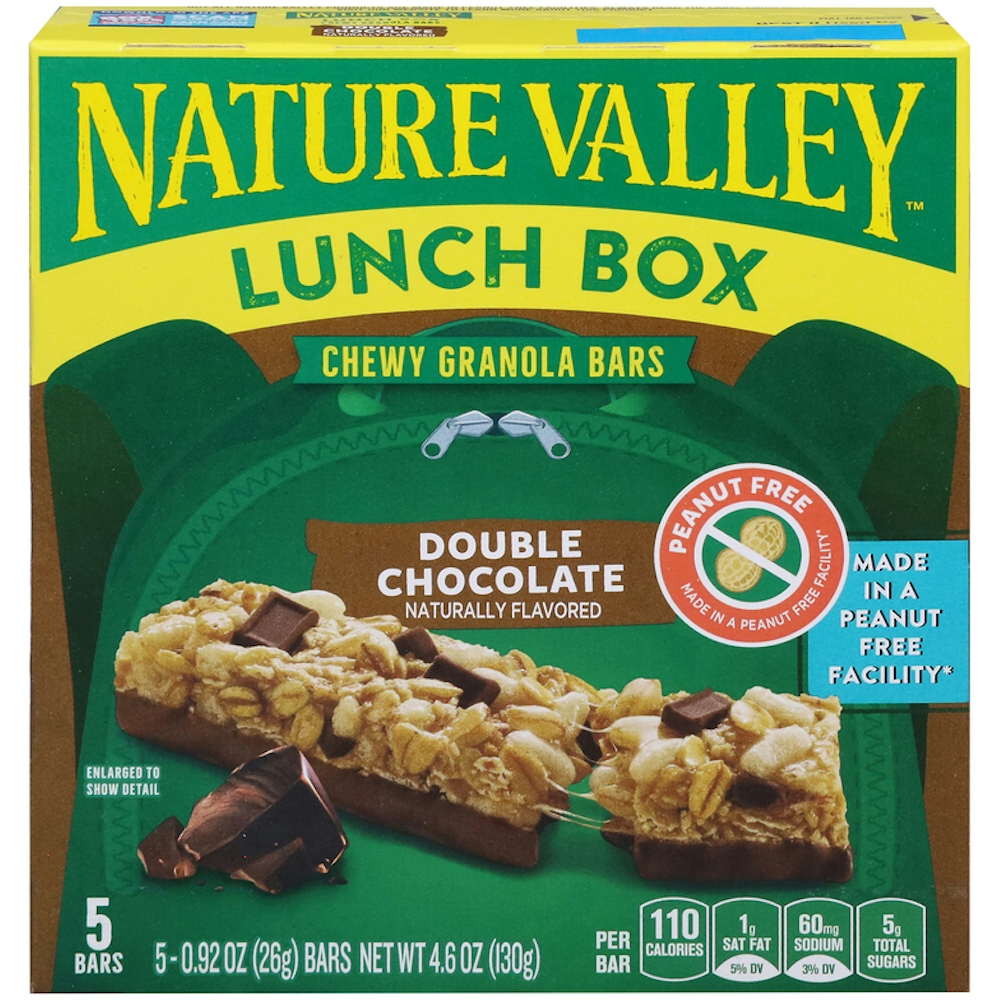 Pack Nature Valley Lunch Box Chewy Granola Bars, the snack that's peanut free and made in a peanut free facility. Every Double Chocolate flavor granola bar brings you Nature Valley goodness and a delicious taste. Each serving provides 8g whole grain (At least 48g recommend daily), without artificial flavors, artificial colors, or high fructose corn syrup. Kids will love the irresistible taste of whole grain oats, milk chocolate, and chocolate chunks. Parents can feel good about serving a wholesome snack. Enjoy a Nature Valley Lunch Box Bar as a tasty addition to your pantry, an after school treat at home, a quick bite on the go, and more. At Nature Valley, we believe that what you put in is what you get out. So wherever the moment takes you, you can rely on our great-tasting snacks to help keep you going. Contains five bars. Not all Nature Valley products are made in peanut-free facilities. Visit our website to learn more about this product.