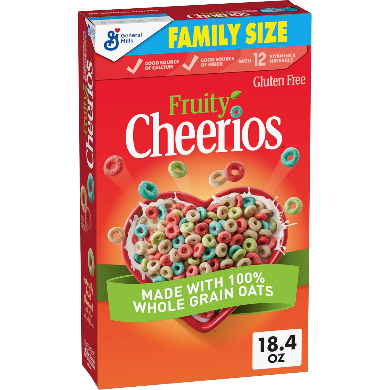 Cheerios | Cheerios is a trusted name in wholesome cereals, bringing heart-healthy goodness to every bowl. Fruity Cheerios Family Size is a deliciously sweetened whole grain oat cereal with a fruity twist, now in fun, limited-edition Happy Heart Shapes. Made with whole grain oats to support heart health Helps lower cholesterol as part of a heart-healthy diet Gluten-free and free from artificial flavors Perfect with milk for breakfast or as an on-the-go snack Provides 21g of whole grains per serving Limited-edition Happy Heart Shapes to celebrate those who inspire you Large 18.4 oz family-size box for sharing and stocking up.