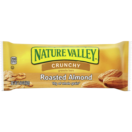 The Original Crunch. Nature Valley Roasted Almond Crunchy Granola Bars are a tasty snack made with whole-grain oats and roasted almonds. A portable snack perfect for the pantry, lunch box, and hiking trail. There are no artificial flavors, colors or high fructose corn syrup, and these snack bars contain 21g of whole grain per serving (at least 48g recommended daily). It's a breakfast snack bar, an office snack or an on-the-go treat everyone in your household can enjoy. At Nature Valley, we believe that what you put in is what you get out. So wherever the moment takes you and your family, you can rely on our great-tasting snacks to help keep you going. Includes six two-bar pouches, 12 bars total.