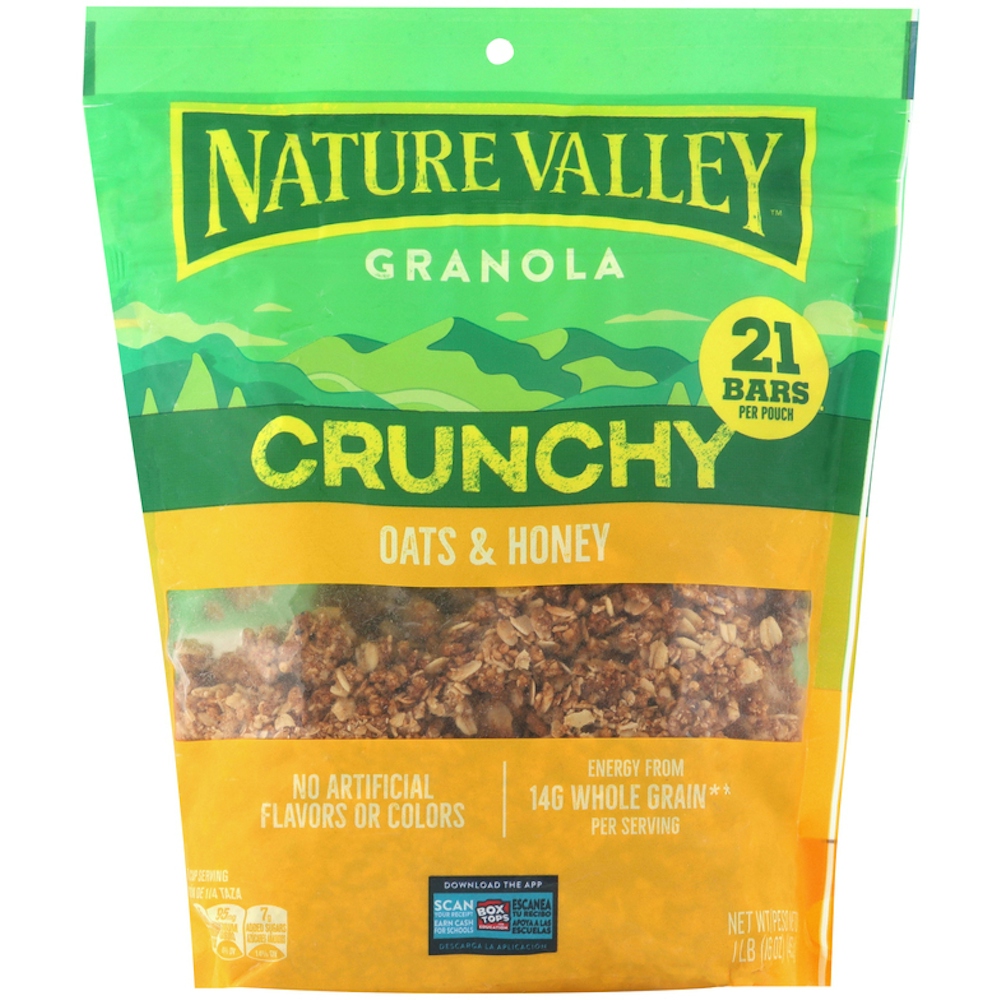 Fuel your adventures any time, any place with Nature Valley Crunchy Oats and Honey Granola. This 16 oz pouch has 21 bars' worth of granola. The taste of sweet honey and the goodness of granola made with whole grain oats are a wholesome way to kick-start your day. Each serving provides energy from 14g whole grain (at least 48g recommended daily). Plus, the crunchy oats and honey granola clusters have no artificial flavors or colors, and no high fructose corn syrup. So whether you enjoy a bowlful as a breakfast cereal or take along the Pouch for family snacks on the run, this oat and honey granola mix delivers on the go energy. Add your own fruit and nut combination for DIY trail mix. Sprinkle the Nature Valley granola clusters over a yogurt parfait or acai bowl for serious crunch. This pouch of loose granola cereal is resealable for easy school snacks or part of breakfast on the go. At Nature Valley, we believe that what you put in is what you get out. So wherever the moment takes you and your family, you can rely on our great-tasting snacks to help keep you going, whenever and wherever you need it. Contains one plastic pouch of crunchy Nature Valley Crunchy Oats and Honey Granola, 16 oz; perfect for instant snacking, or a part of breakfast and meals.