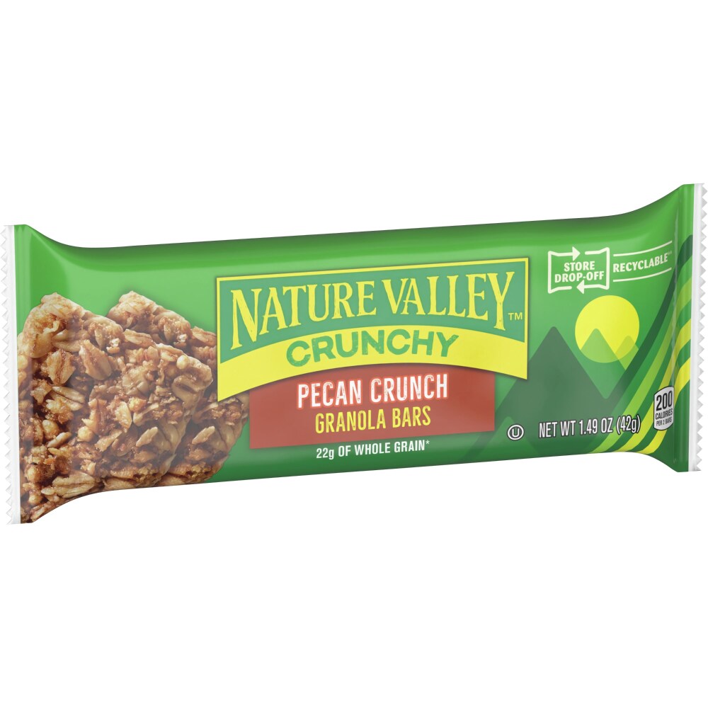 The Original Crunch. Nature Valley Pecan Crunch Crunchy Granola Bars are a tasty snack made with whole-grain oats and real pecans. A portable snack perfect for the pantry, lunch box, and hiking trail. There are no artificial flavors, colors or high fructose corn syrup, and these snack bars pack an excellent source of whole grains with 22 grams per serving. It's a breakfast snack bar, an office snack or an on-the-go treat the whole family can enjoy. At Nature Valley, we believe that what you put in is what you get out. So when you need to be great out there, you can rely on us for real energy, wherever and whenever you need it. Energy you can depend on. Includes six two-bar pouches, 12 bars total.