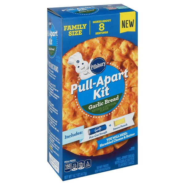 Looking for a crowd pleasing side dish or appetizer for tonight? Try Pillsbury Pull Apart Garlic Bread with sauce. This family-size pull-apart bread kit comes with pre-cut dough and garlic-butter-flavored sauce. Just add melted butter and shredded cheese for delicious garlic bread ready in minutes. Follow the simple prep and baking instructions and bake a delicious, shareable snack for everyone.