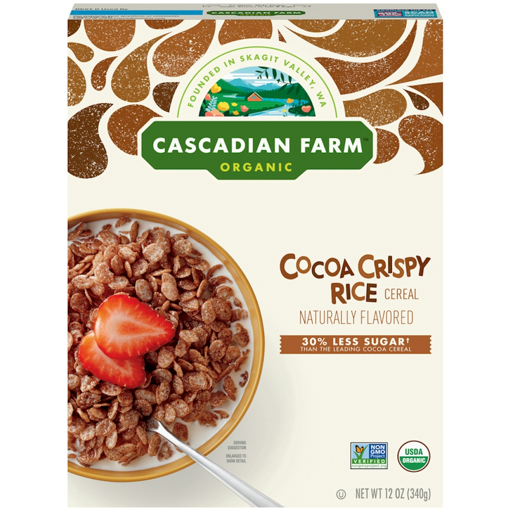 - The product category for Cascadian Farm Organic Cocoa Crispy Rice Cereal is Rice.