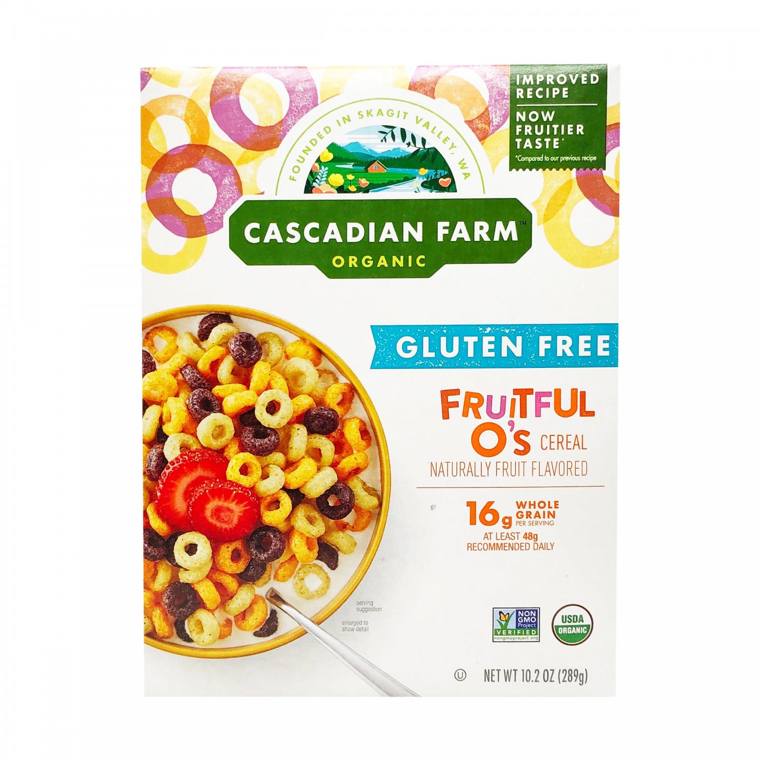 - The country of origin for Cascadian Farm Organic Gluten Free Fruitful O'S Breakfast Cereal is United States.