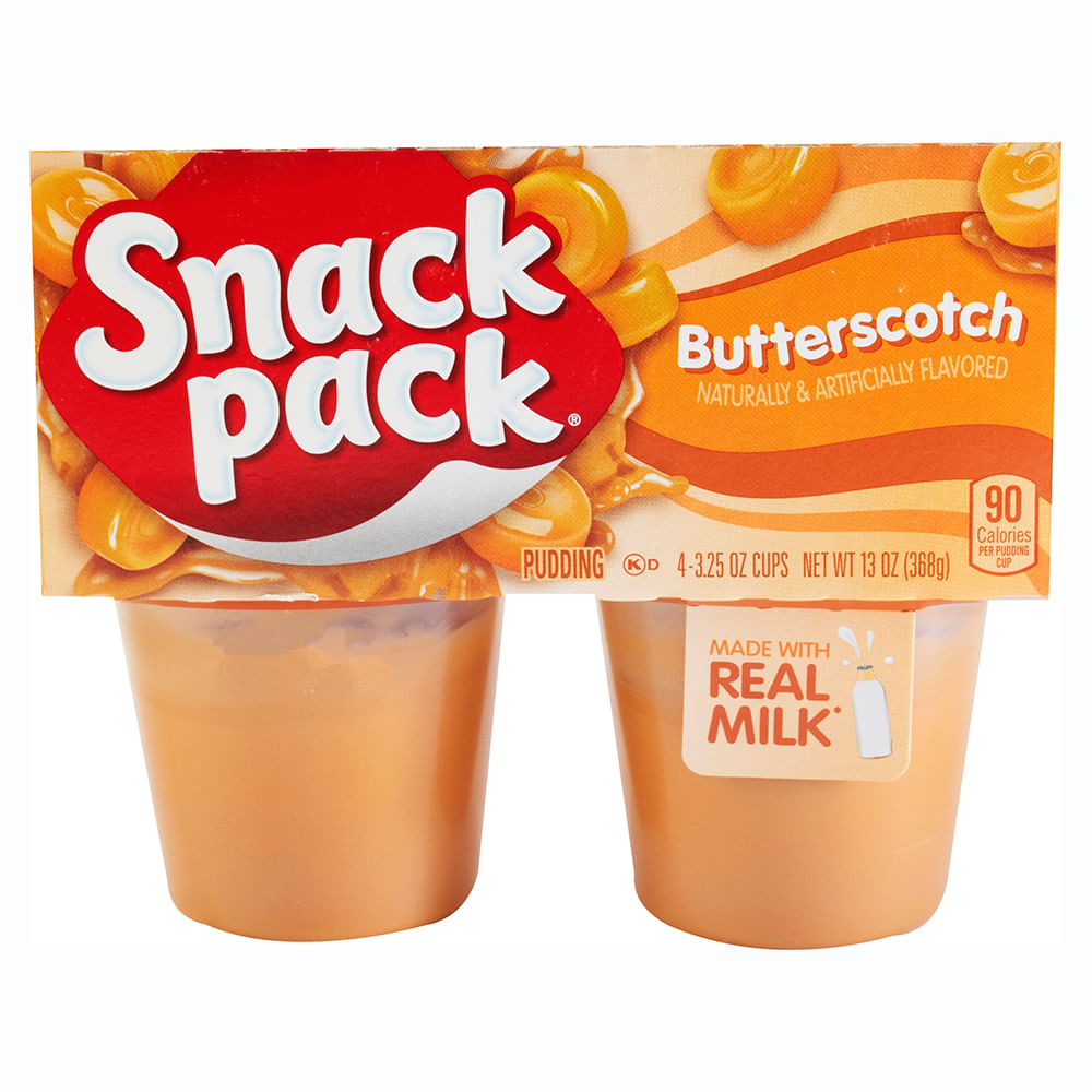 Grocery & Gourmet Food. Pudding. Puddings & Gelatins. Snack Foods. Snacks & Sweets. Enjoy a delicious snack anytime on-the-go with Snack Pack Butterscotch Pudding Cups. The flavor of this butterscotch pudding dessert is where sweet and creamy meets delicious. Butterscotch Snack Pack pudding is made with real milk and no high-fructose corn syrup. Perfect for an after-lunch or after-dinner treat that your kids will love. Snack Pack Butterscotch Pudding Cups have 90 calories with no preservatives and zero grams trans fat per 3.25 oz serving.