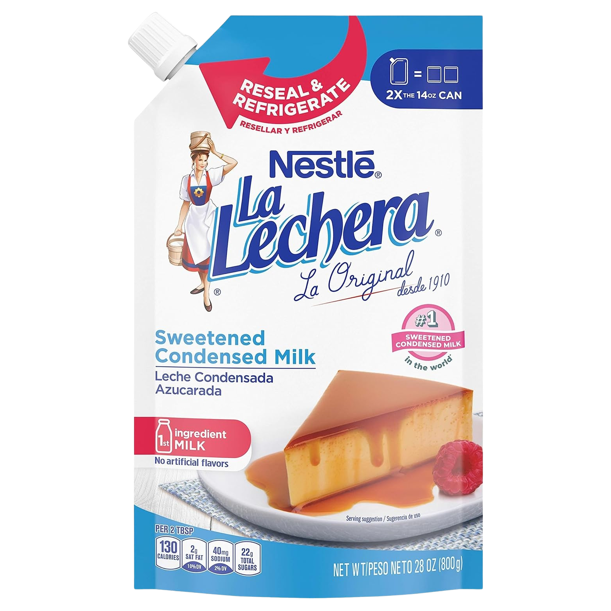 Nestle La Lechera Sweetened Condensed Milk adds creamy sweetness to your favorite drinks and dessert. La Lechera condensed milk is only made with milk and sugar and no artificial flavors. La Lechera sweetened condensed milk comes in a resealable bottle, perfect to add a squeeze to any treat or snack. Drizzle La Lechera sweetened condensed milk over fresh fruit, pancakes, tres leches cake, flan or even add it to your morning coffee for a flavorful, creamy delight, sweet treat coffee creamer. Refrigerate La Lechera sweetened condensed milk after opening. Make each and every dessert something special when you use La Lechera Sweetened Condensed Milk.