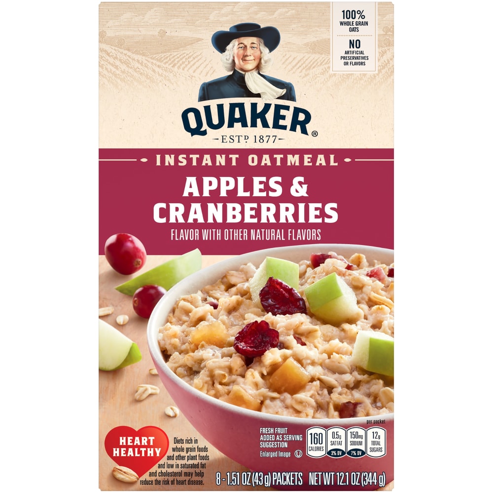 - The product category for Quaker Apple & Cranberries Instant Oatmeal(8-1.51 Oz)12.1 Ounce 8 Packets Box is Oats, Grits & Hot Cereal.