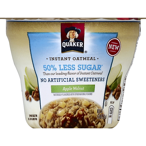 - The product category for Quaker 50% Less Sugar Apple Walnut Instant Oatmeal 1.34 Ounce Cup is Oats, Grits & Hot Cereal.