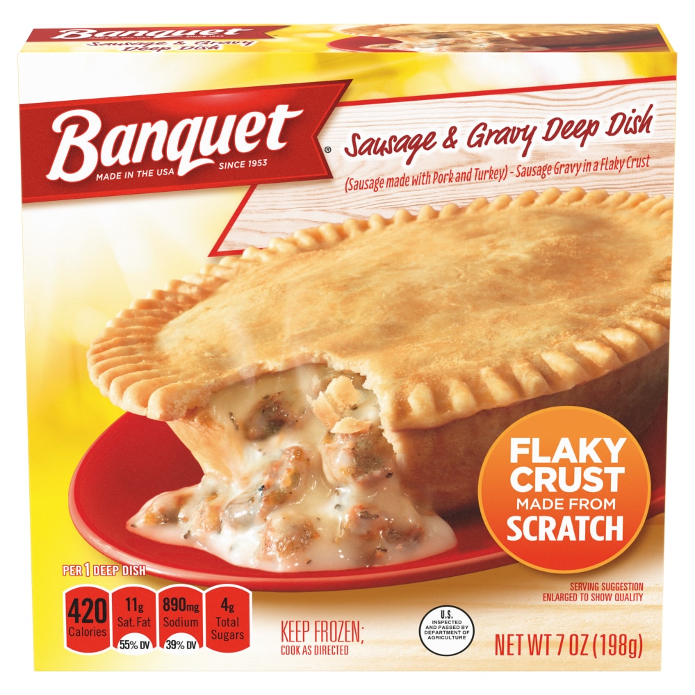 - The product category for Banquet Sausage and Gravy Deep Dish Pot Pie, Frozen Meal, 7 Oz. is Pies & Tarts.