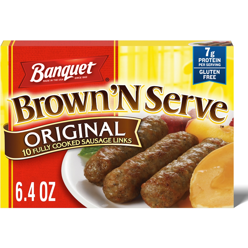 - The product category for Banquet Brown 'N Serve Original Fully Cooked Sausage Links, Frozen Meat, 10 Count, 6.4 Oz. is Meat.