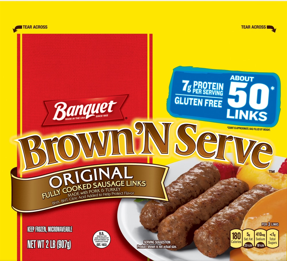 - The manufacturer of Banquet Brown 'N Serve Original Fully Cooked Sausage Links, Frozen Meat, About 50 Count*, 32 Oz is Banquet.