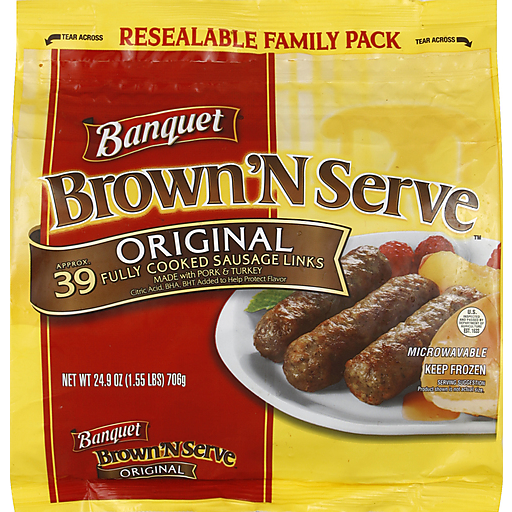 Fully cooked. Made with pork & turkey. Citric acid, BHA, BHT added to help protect flavor. US inspected and passed by Department of Agriculture. Microwavable. Resealable family pack. Food you love. It's the perfect addition for a wide variety of breakfast foods. Banquet Brown 'N Serve original links are the quick, easy and convenient way to enjoy a sausage. Already cooked, Banquet Brown 'N Serve original links deliver that fresh, out of the pan taste in just minutes. This resealable bag makes it easier to prepare a single serving or enough for the entire family.