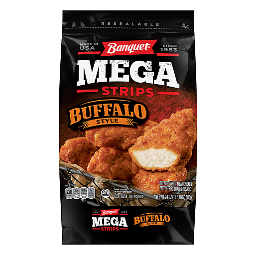 - The manufacturer of Banquet Mega Strips Buffalo Style is Banquet.
