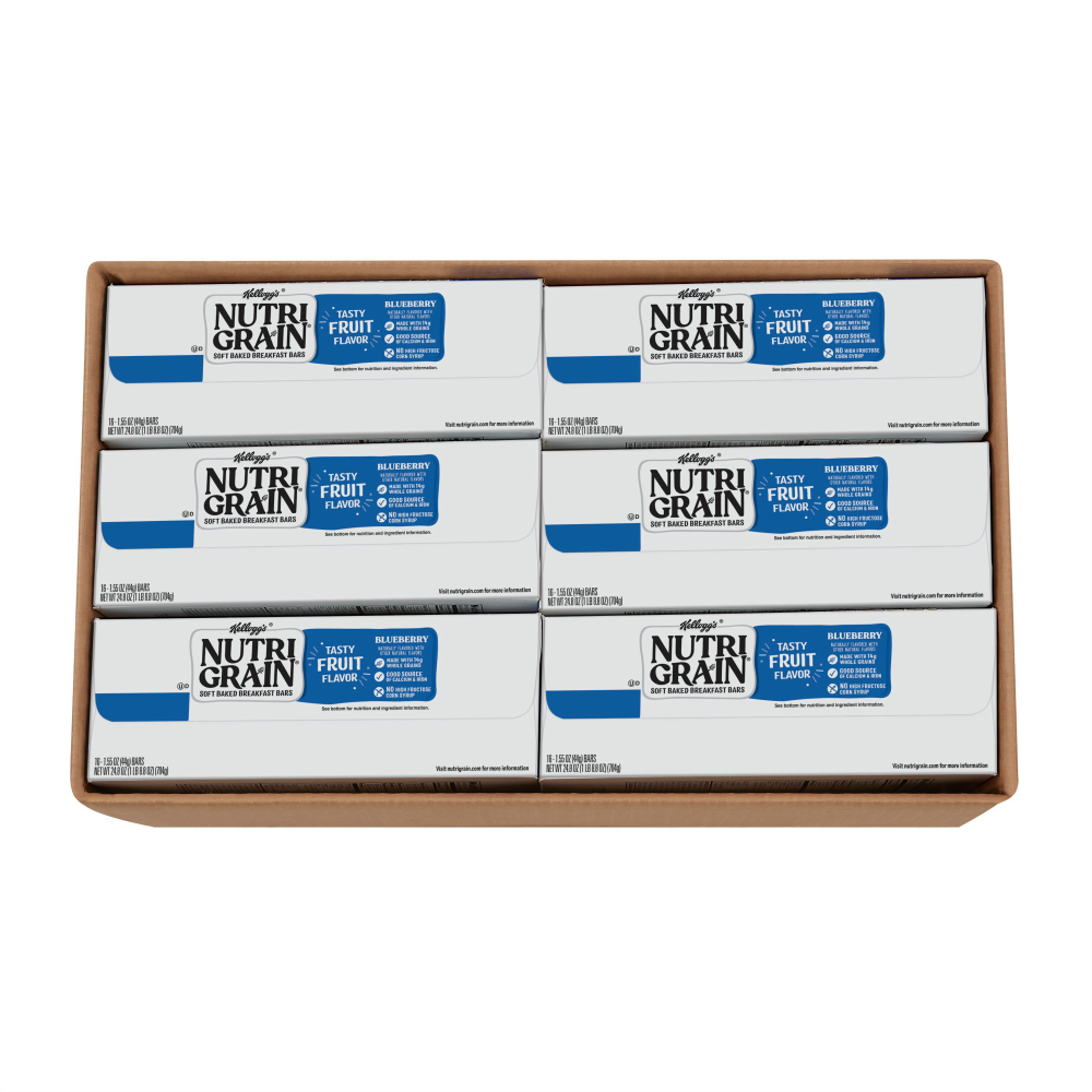 The Kellogg s Nutrigrain Blueberry Cereal Bar makes a good breakfast or snack option that can be enjoyed by kids and adults alike. Made with whole grains and real fruit, it is a good source of calcium and iron. The bulk case with 96 Kellogg s Nutrigrain..