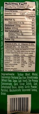 Turkey Meat, Water, Seasonings (Textured Soy Flour, Breadcrumbs [Wheat Flour, Sugar, Salt, Yeast], Soy Protein Concentrate, Corn Syrup Solids, Salt, Dehydrated Onion,Spices, Garlic Powder, Parsley), Mechanically Separated Turkey, Onion