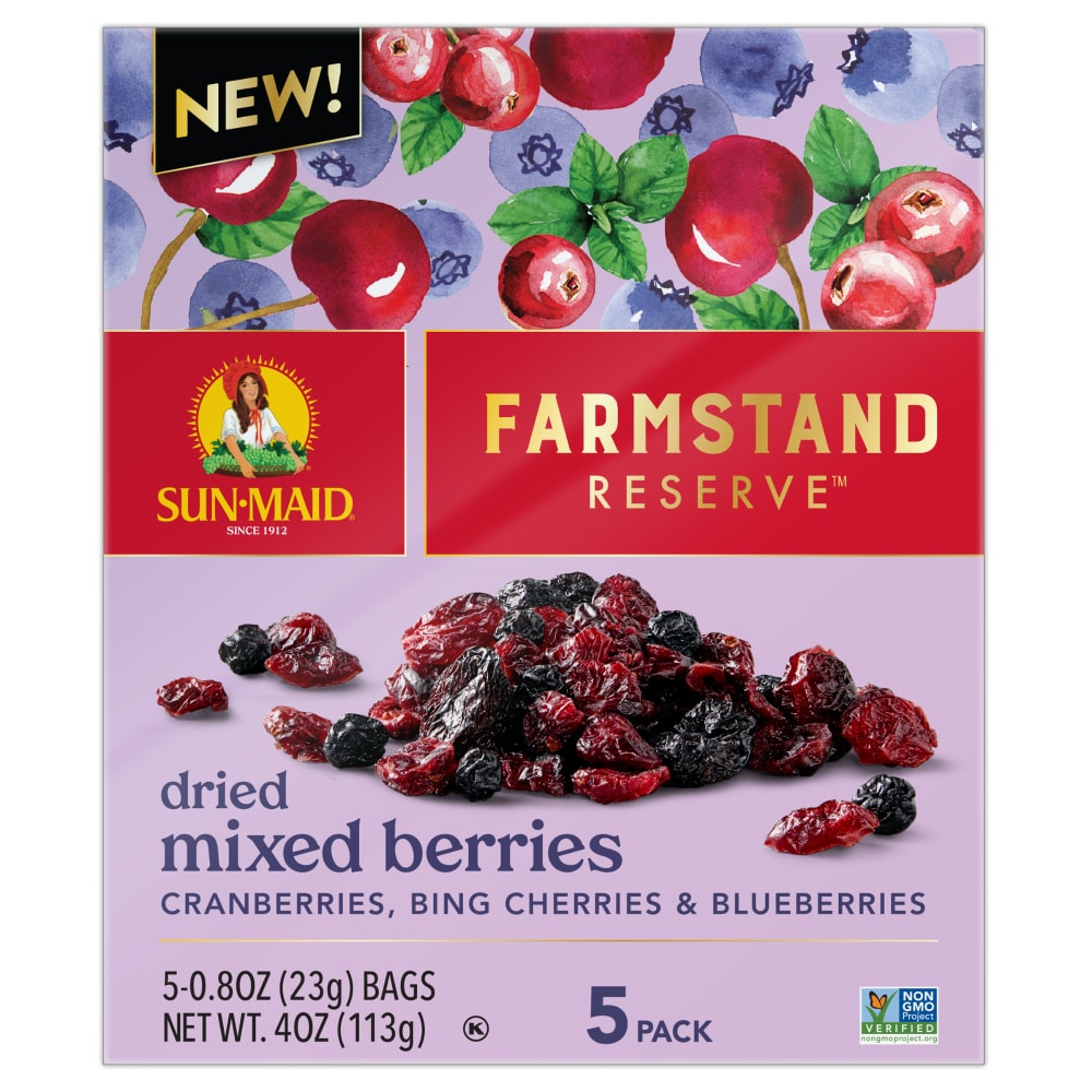 - The product category for Sun-Maid Farmstand Reserve Dried Mixed Berries 5-Ct Box/.8Oz Bag is Fruits & Vegetables.