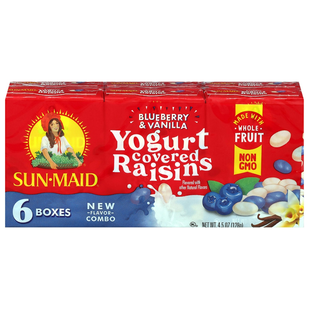- Kids crave, moms approve, made with whole fruit. Sun-Maid®’s timeless and trusted raisins wrapped in blueberry & vanilla yogurt. A better for you, on-the-go snack that’s got your cravings covered. Sweet and creamy without the guilt of candy. Make Sun-Maid® Blueberry & Vanilla Yogurt Covered Raisins part of your daily routine, at home or on the go. Made with Whole Fruit. Non-GMO. Flavored with Other Natural Flavors. OK Kosher - Dairy. Store in Dry & Ambient Temperatures. Ready to Eat - Enjoy Right Out of the Package. 6-Pack.