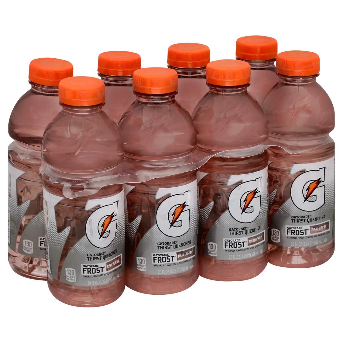 - The product category for Gatorade Frost Rain Berry (8 - 20 Fluid Ounce) 160 Fluid Ounce 8 Pack Plastic Bottle is Beverages.