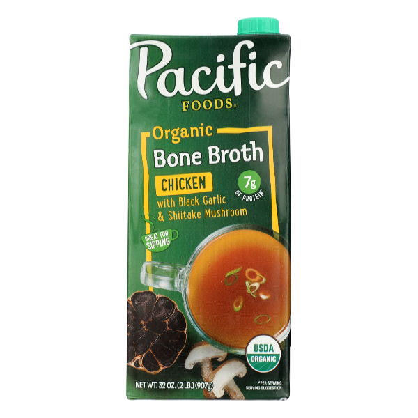 - The manufacturer of Pacific Foods Organic Chicken Bone Broth with Black Garlic and Shiitake Mushroom, 32 Oz Carton is Pacific Foods.