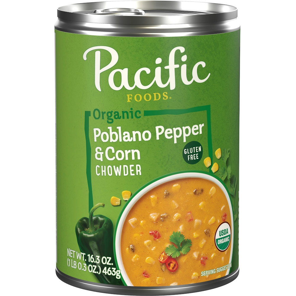 - The product category for Pacific Foods Organic Poblano Pepper and Corn Chowder, 16.3 Oz Can is Soups & Broths.