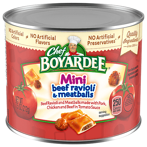- The product category for Chef Boyardee Microwaveable Mini Ravioli and Meatballs, 7.5 Oz is Meat.