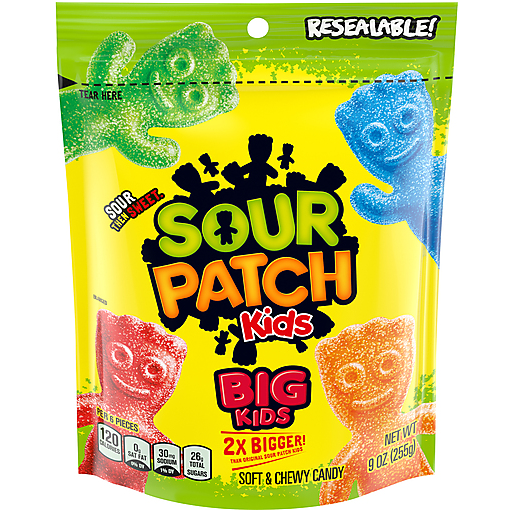 SOUR PATCH KIDS Big Kids Soft & Chewy Candy packs all the classic flavor into a mischief-filled soft candy. Each of these unique kid shaped candy pieces are two times bigger than original SOUR PATCH KIDS, which just makes them twice as awesome. The signature assorted fruit flavors create a SOUR THEN SWEET candy that satisfies your taste buds. Enjoy this big candy whenever you want a SOUR THEN SWEET treat by keeping it on-hand for a quick snack or as a holiday treat for Halloween, Valentine's Day or even for a candy lover's birthday. SOUR PATCH KIDS also make a great movie theater candy to snack on during your favorite flick. This bag of candy comes sealed to maintain softness and the SOUR THEN SWEET flavor.