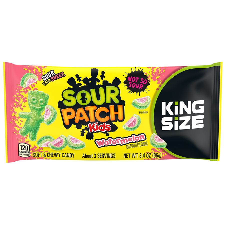 Sour Patch Watermelon candies are tangy, sugar-coated gummies shaped like watermelon slices. The king size pack offers more of these deliciously chewy treats to satisfy your sweet and sour cravings.
