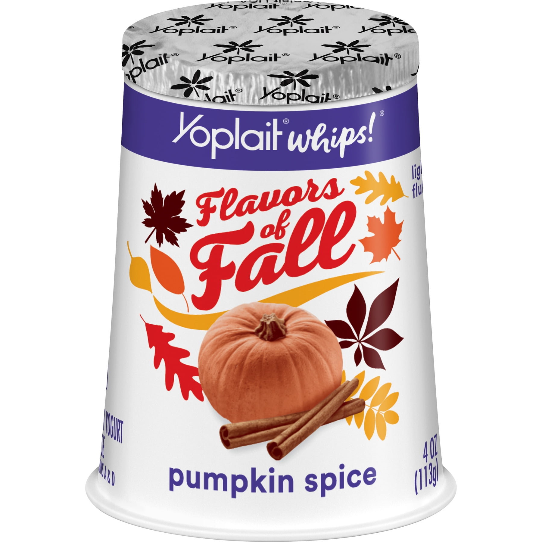 Yoplait Whips! Pumpkin Spice Yogurt Mousse turns regular yogurt into a fluffy mousse-styled version of Yoplait succulence sure to satisfy even the most discerning sweet tooth. Naturally Gluten Free and with no artificial flavors, colors from artificial sources or high fructose corn syrup; Indulgent treats have never been SO good!Try Yoplait Whips! frozen. Seasonal Flavor.