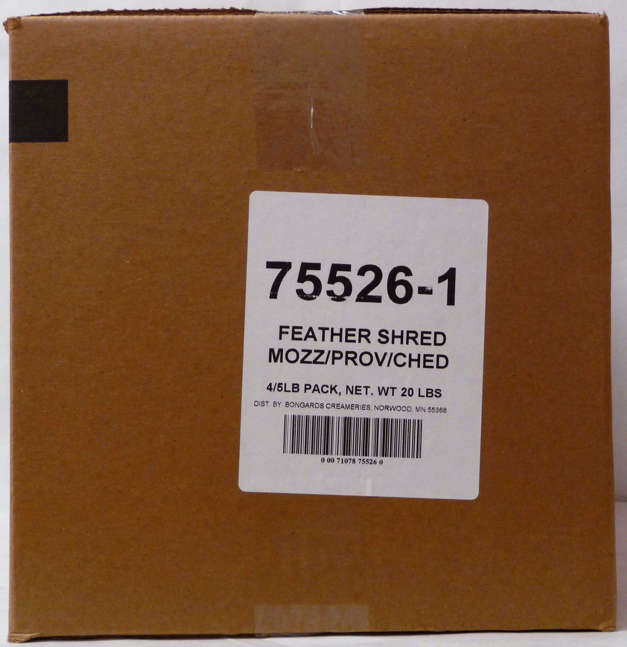 - The UPC barcode for Bongards Mozzarella, Provolone, and Cheddar Feather Shred - 5# is 00071078755260.