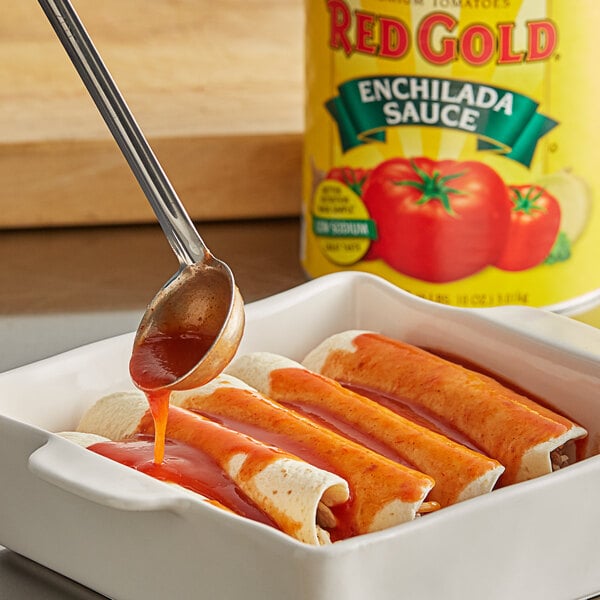 Keep a delicious and versatile sauce on-hand in your busy kitchen with the Red Gold #10 can enchilada sauce. With a beautiful blend of fresh, sustainably produced tomatoes that were grown on family-owned farms, this tomato juice is enhanced with the addition of chili peppers, onion powder, and red pepper spices to give it an authentic, Mexican-style flavor that's ready-to-use in your kitchen. Coming in a #10 can, this enchilada sauce keeps your busy kitchen in good supply, while cutting down on valuable prep time and labor cost. Plus, the can uses a non-BPA liner to keep the health of your customers safe, while being a recyclable product that doesn't make a long-lasting impact on the Earth. This enchilada sauce contains zero cholesterol and trans fat, so the sauce itself doesn't feel heavy in the dish and only complements the accompanying ingredients. Use this specialty sauce blend to create traditional enchiladas that are filled with beans, meats, vegetables, or cheese that customers are sure to love. Or, use the enchilada sauce to make casseroles, chilis, stuffed peppers, or chilaquiles to further stretch the use to other dishes on your menu. Since 1942, Red Gold products have been grown by families and enjoyed by families. Ensuring you get a premium product created in a sustainable manner, their tomatoes have been grown in partnership with local family farmers for many generations. Always keep Red Gold tomato products on hand in your kitchen to create a culinary masterpiece that brings people together.
