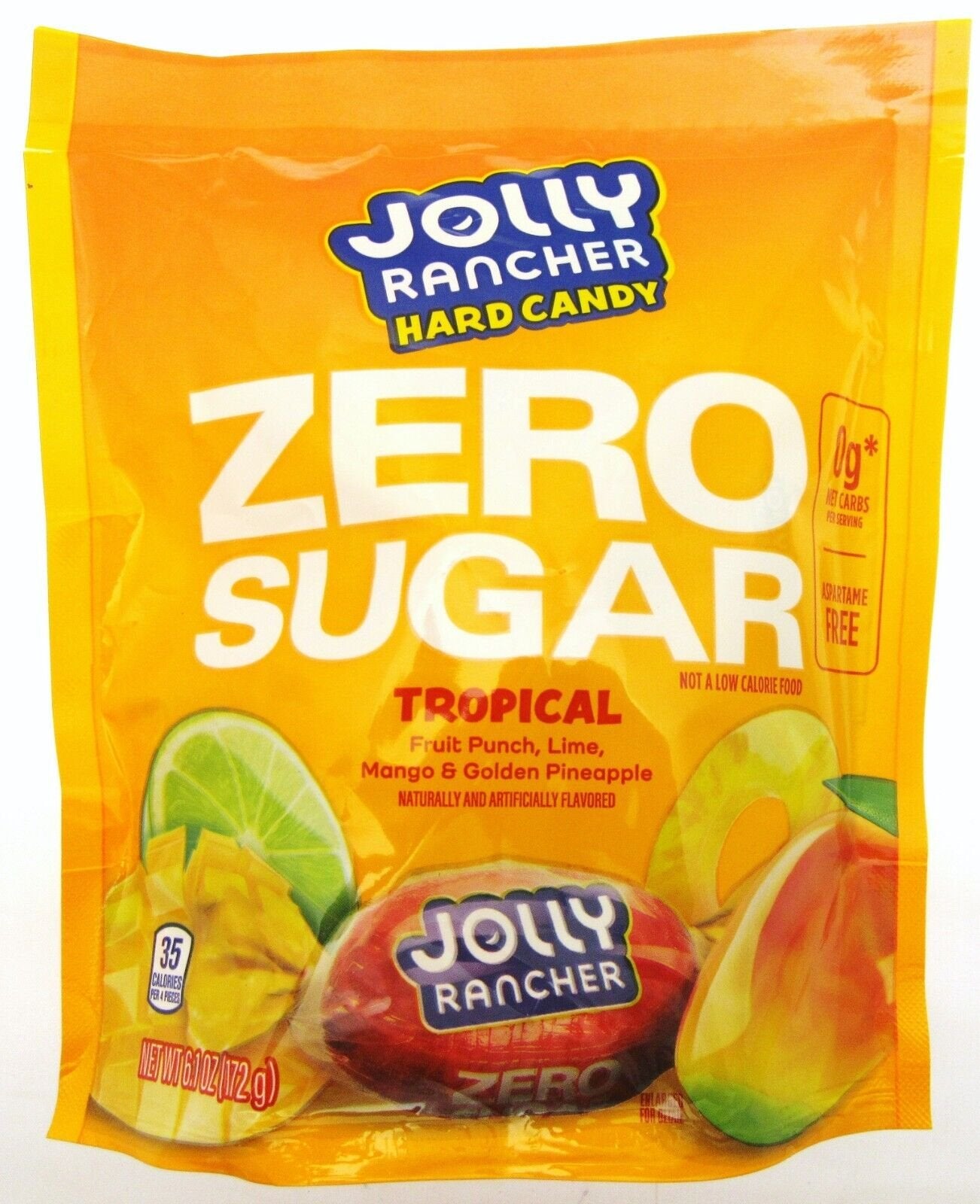 Jolly Rancher Tropical Zero Sugar Hard Candy ~ 6.1 oz (172g) Bag ~ Golden Pineapple, Fruit Punch, Lime, Mango · · Indulge in the mouth-watering taste of Jolly Rancher's Tropical Zero Sugar hard candy with this 6.1 oz bag. Enjoy the zero sugar, aspartame-free treat that contains only 35 calories per serving.
