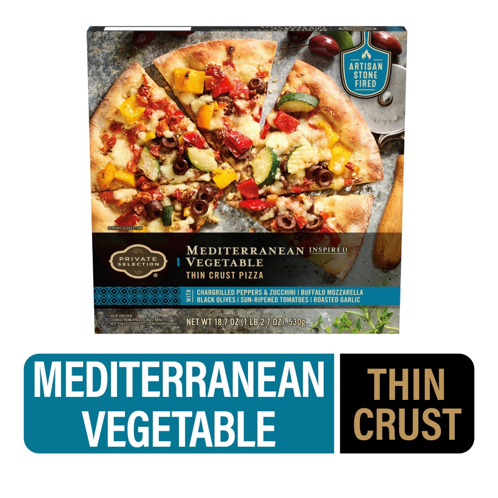 Private Selection™ Mediterranean Inspired Vegetable Thin Crust Pizza is crafted with the finest ingredients. The sourdough is proofed for 24 hours and the crust is baked on hot, white granite stones to create an irresistible flavor, texture and restaurant-style charring. The earthy flavors of chargrilled peppers and zucchini are balanced by buffalo mozzarella, black olive tapenade style sauce, sun-ripened tomatoes, black olives, pecorino Romano cheese and roasted garlic to create mouthwatering pizza inspired by the classic flavors of Mediterranean cuisine. The Private Selection journey rewards your sense of good taste. Inspired by food artisans and crafted with authentic ingredients and tantalizing recipes, each Private Selection offering is sure to feed your passion for gourmet foods.