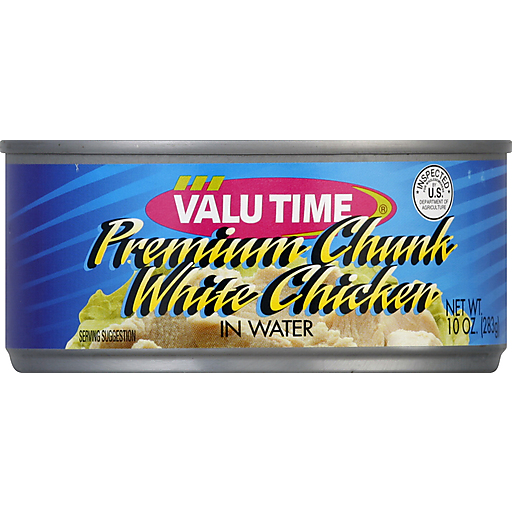 Valu Time Chicken Premium Chunk White, In WaterWhite Chicken Meat, Water, Modified Corn Starch, Salt, Sodium PhosphatesPremium Chunk White Chicken In Water is manufactured by Kingston Marketing Co with a suggested serving size of 2 ONZ (56 g) and 70 calories per serving.