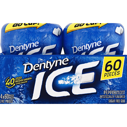 Practice safe breath and get intense freshness with Dentyne Ice Sugar-Free Gum. Dentyne Ice has a bold icy flavor that keeps breath fresh for up to 40 minutes after you re finished chewing. Stay on top of your game with the classic timeless taste of Peppermint Dentyne Ice. With 35% fewer calories than sugared gum Dentyne Ice is the smart way to stay fresh. This package contains four 60-piece bottles of Peppermint Dentyne Ice Sugar-Free Gum.