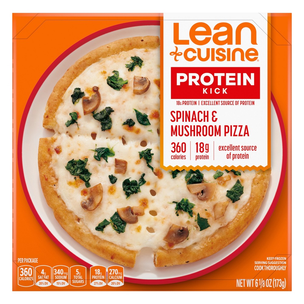 Add a kick of protein to your day with a Lean Cuisine Protein Kick Spinach and Mushroom Frozen Pizza Frozen Meal. At 360 calories and 18 grams of protein per package, this easy-to-make Lean Cuisine frozen meal is an excellent source of protein and features a delicious pizza topped with spinach and mushrooms. Each 6 1/8-ounce frozen Lean Cuisine pizza can be enjoyed on its own or served with a side salad. Pair your microwave pizza with soup, or customize it with your favorite add-ons. This spinach and mushroom pizza is ready in less than six minutes and makes a convenient lunch, dinner or snack. Lean Cuisine entrees are made with premium ingredients for a tasty, feel-good meal. This frozen veggie pizza is made with no artificial colors, flavors or preservatives for a satisfying meal. Lean Cuisine frozen meals are not your mother’s diet food. You won’t find any fad diets or miracle cures here – just a solid nutritional foundation and great taste. Lean Cuisine offers a variety of delicious frozen dinners and snacks, all 400 calories or less. For more meal options from Lean Cuisine, try Lean Cuisine Protein Kick Supreme Pizza or Santa Fe-Style Rice and Beans.