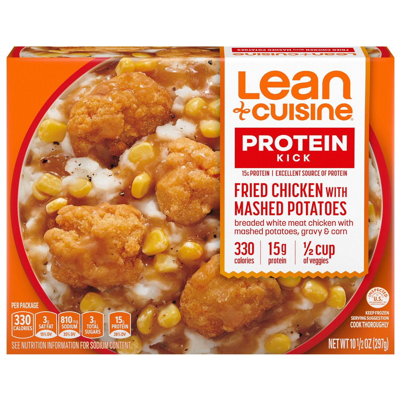 Add a kick of protein to your day with a Lean Cuisine Protein Kick Oven Fried Chicken with Mashed Potatoes Frozen Meal. At 300 calories and 14 grams of protein per package, this easy-to-make Lean Cuisine chicken entree features breaded white meat chicken with mashed potatoes, gravy and corn. Enjoy this 10.5-ounce frozen chicken meal on its own or with a side salad as part of an easy comfort food meal. Pair your Lean Cuisine frozen dinner with soup, or customize it with your favorite add-ons. Quick and easy to prepare, this microwave meal is ready in less than six minutes, making it a convenient lunch, dinner or snack at home or in the office. Lean Cuisine TV dinners are made with premium ingredients for a tasty frozen dinner that rivals take-out. This delicious Lean Cuisine meal is made with no artificial flavors and offers 1/2 cup of vegetables per serving for a satisfying frozen dinner you can feel good about. Lean Cuisine single serve frozen meals are not your mother’s diet food. You won’t find any fad diets or miracle cures here – just a solid nutritional foundation and great taste. For more Protein Kick meal options from Lean Cuisine, try the Roasted Turkey and Vegetables or Glazed Chicken.