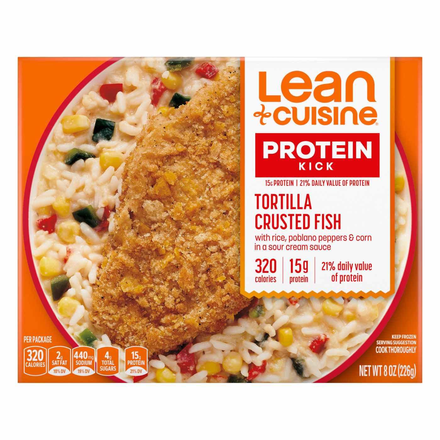 Tortilla Crusted Alaska Pollock (Alaska Pollock, Enriched Bleached Wheat Flour [Flour, Niacin, Ferrous Sulfate, Thiamine Mononitrate, Riboflavin, Folic Acid], Modified Corn Starch, Water, Vegetable Oil [Canola, Cottonseed, Soybean And/Or Sunflower], Tortilla Chips [Yellow Whole Corn, Vegetable Oil {Corn, Soybean And/Or Sunflower Oil}], Enriched Wheat Flour [Flour, Niacin, Ferrous Sulfate, Thiamine Mononitrate, Riboflavin, Folic Acid], 2% or Less of Spices, Carrot Powder, Potassium Chloride, Citric Acid, Salt, Garlic Powder, Whey, Torula Yeast, Yellow Corn Flour, Natural Flavors, Sugar, Soy Flour, White Corn Flour, Yeast, Tomato Powder, Chili Powder [Chili Pepper, Cumin, Oregano, Salt, Dehydrated Garlic], Dextrose, Onion Powder, Corn Starch, Leavening [Sodium Bicarbonate, Sodium Aluminum Phosphate], Egg Whites, Maltodextrin, Annatto Extract [Color]), Cooked Enriched Long Grain Rice (Water, Rice, Iron, Niacin, Thiamin Mononitrate, Folic Acid), Skim Milk, Corn, Red Peppers, Water, Green Ground Tomatoes, Poblano Chiles, Onions, Reduced Fat Cheddar Cheese (Cultured Part-Skim Milk, Salt, Enzymes, Annatto, Vitamin a Palmitate), 2% or Less of Buttermilk Powder, Dehydrated Sour Cream (Sour Cream [Cultured Cream, Skim Milk]), Soybean Oil, Cornstarch, Salt, Garlic, Spices, Jalapeno Puree (Jalapeno Peppers, Salt, Acetic Acid, Water, Calcium Chloride), Lime Juice Concentrate, Cultured Whey, Maltodextrin, Enriched Flour (Wheat Flour, Niacin, Reduced Iron, Thiamine Mononitrate, Riboflavin, Folic Acid), Sugar, Potassium Chloride.