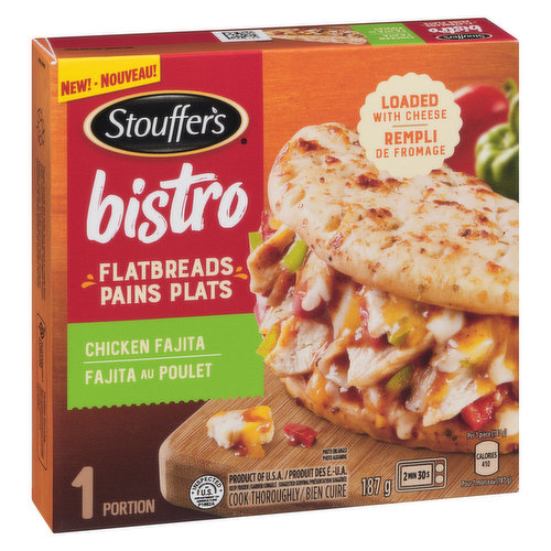 You don't need to wait in long lunch lines to satisfy those bistro cravings. STOUFFER'S Bistro Flatbreads, Chicken Fajita is a delicious, oven-baked flatbread loaded with grilled chicken strips, red and green peppers, fajita sauce and real cheddar cheese. This ooey-gooey cheesy flatbread is all ready to be toasted to a perfect golden brown in only a few minutes in your oven or microwave.