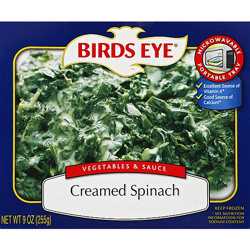 Birds eye?? vegetables & sauce creamed spinach. With a real cream sauce. Microwavable portable tray. Delicious side dish. Excellent source of vitamin a*. Good source of calcium*. *see nutritional information for sodium content.