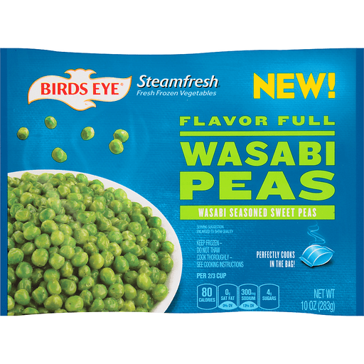- The manufacturer of Wasabi Peas is Birds Eye.