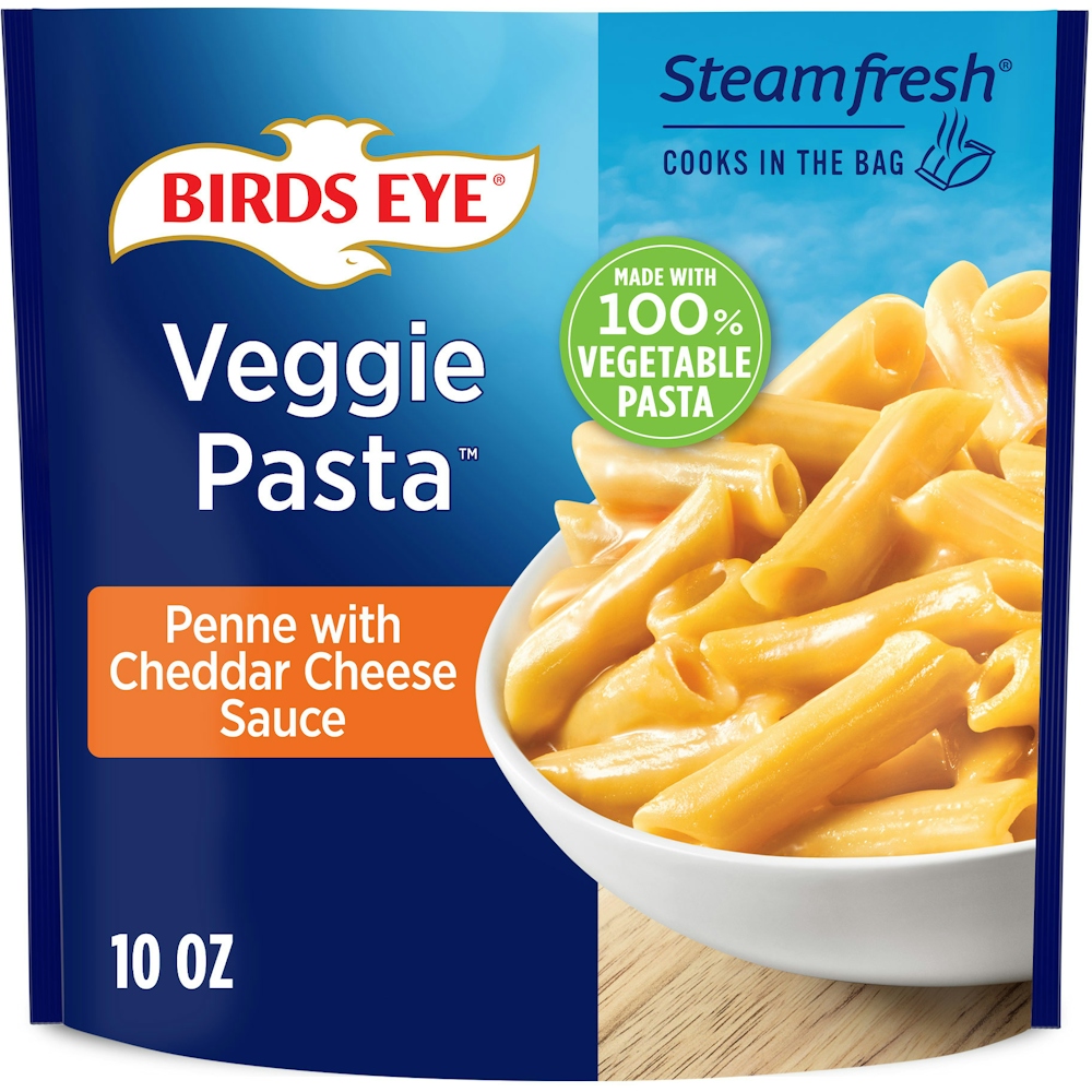 Enjoy savory sides without the hassle with Birds Eye Veggie Pasta Penne with Cheddar Cheese Sauce. Made from zucchini and lentils, this 100% vegetable pasta side is covered in creamy cheddar cheese sauce for a delicious frozen side. Each serving of lentil and zucchini noodles provides a full serving of vegetables, and this veggie pasta is made with no artificial flavors for a delicious way to enjoy frozen sides. Serve these frozen vegetables as pasta sides or add meat to make it a meal. Prepare the lentil pasta on the stove in 7 minutes or in the microwave in less than 5 minutes.